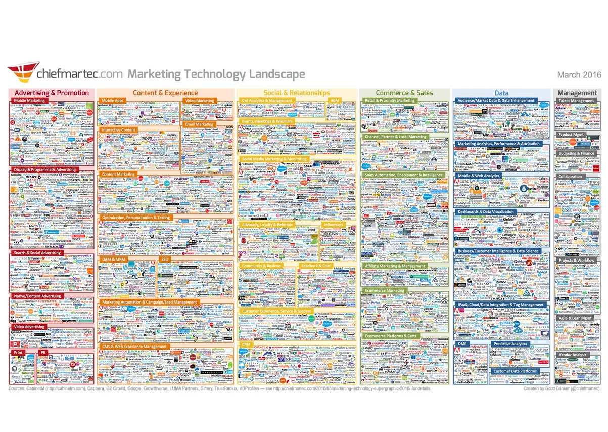 Sicuramente il trend principale ruota attorno all’integrazione tra i processi vecchi e quelli nuovi legati al marketing e alle vendite: la divisione tra marketing tradizionale e digital marketing dovrebbe sparire. Tecnologie e strumenti stanno aumentando: la dimensione del panorama (Marketing Technology Landscape) che sta raccontando Scott Brinker cresce ogni anno di più, sia in complessità che in tipologia di offerta, come si può vedere nell’infografica che tiene aggiornata di anno in anno.