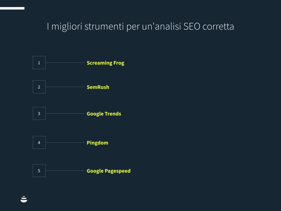 Alcuni dei più famosi e utilizzati sono: Screaming Frog, SemRush, Google Trends, Pingdom, Google Pagespeed.