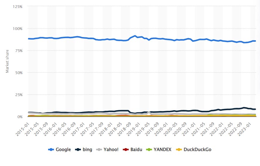 Se i primi due sono molto comuni e conosciuti, il terzo potrebbe non essere sempre presente. Il motivo è che si tende ad ignorare Bing considerandolo un servizio di qualità minore. Tuttavia, nel corso del 2021 il motore di casa Microsoft ha iniziato una risalita , dovuta anche all’integrazione nativa con Windows 10 e 11, che lo sta facendo alzare notevolmente. E, con l’arrivo di ChatGPT, questo dato potrebbe salire ancora.
