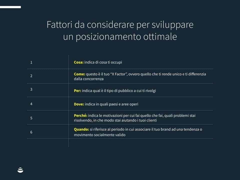 Per sviluppare la tua strategia di posizionamento, puoi utilizzare il seguente elenco come guida :