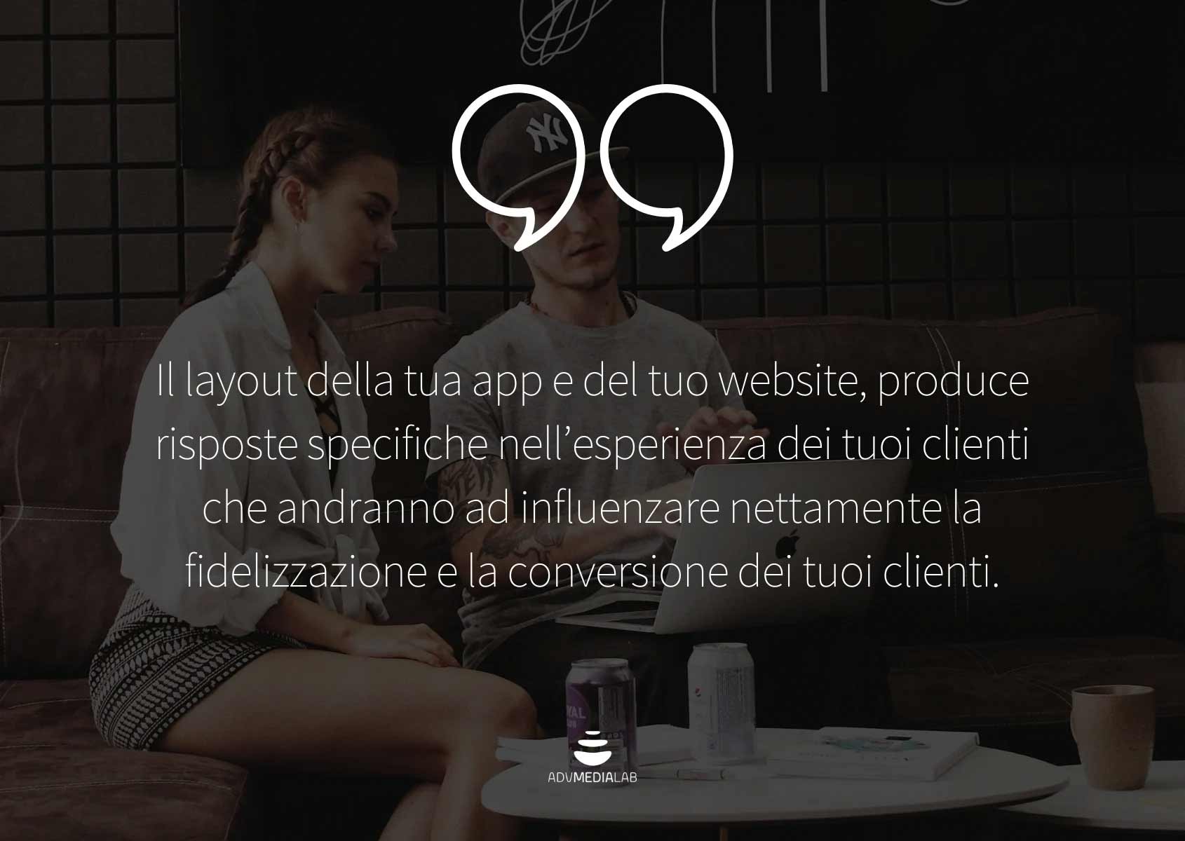 Il layout della tua app e del tuo website, produce risposte specifiche e differenti nell’esperienza dei tuoi clienti , risposte che andranno ad influenzare nettamente la fidelizzazione e quindi la conversione per ognuno dei tuoi clienti.