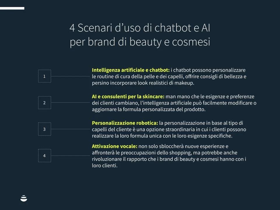 Come abbiamo già detto, i beauty bot utilizzano l’AI e la realtà virtuale (VR) per offrire ai clienti suggerimenti di bellezza, consigli sui prodotti, fissare appuntamenti e creare un’autentica esperienza personalizzata che mira a rafforzare la fedeltà al brand .