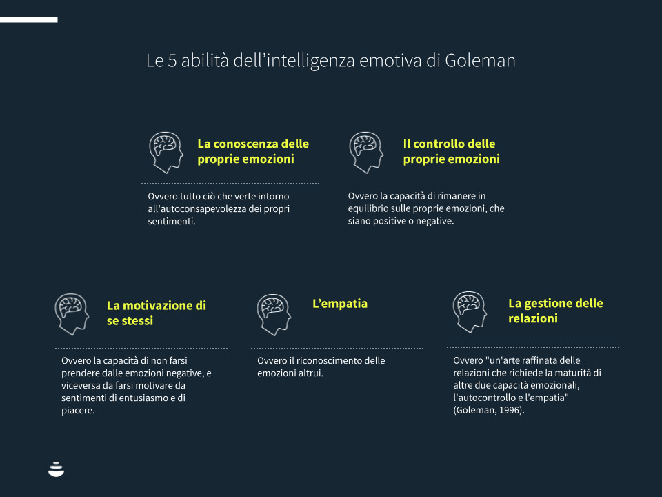 E ancora più nello specifico, per Goleman l’intelligenza emotiva è l’insieme di 5 abilità: