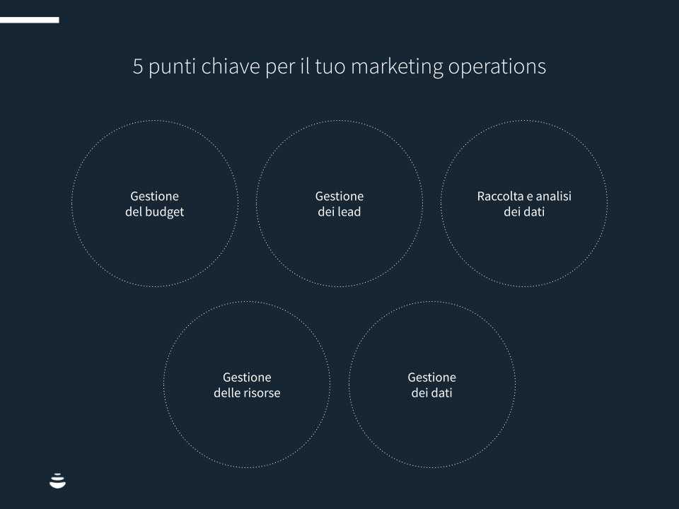 La verità è che con il tempo, il marketing operations diventerà parte integrante della tua routine lavorativa , senza che tu nemmeno te ne accorga. Tuttavia, per poter eccellere devi imparare a padroneggiare cinque attività fondamentali : gestione del budget; gestione dei lead; raccolta e analisi dei dati; gestione delle risorse; gestione dei dati.