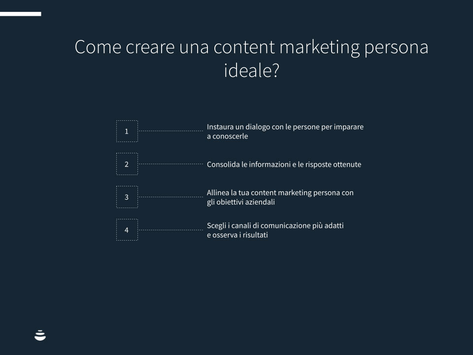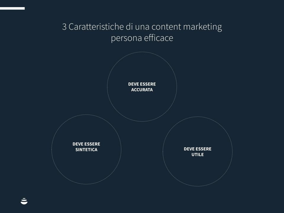 Possiamo riassumere nei seguenti punti chiave gli aspetti su cui è necessario concentrarsi per sviluppare una content marketing persona di successo: