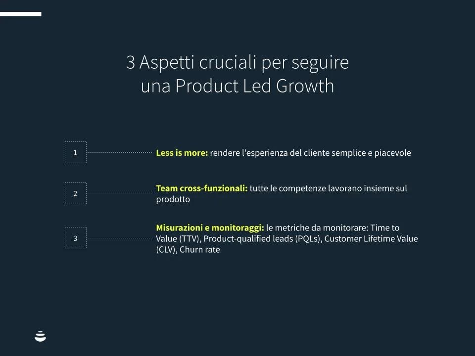 Essere un’azienda PLG significa creare prodotti migliori per il cliente ma anche costruire dei flussi migliori all’interno dell’azienda. Si tratta di creare team cross-funzionali, che mettono insieme competenze in modo trasversale. Il monitoraggio e l’analisi dei dati saranno al base della definizione della strategia
