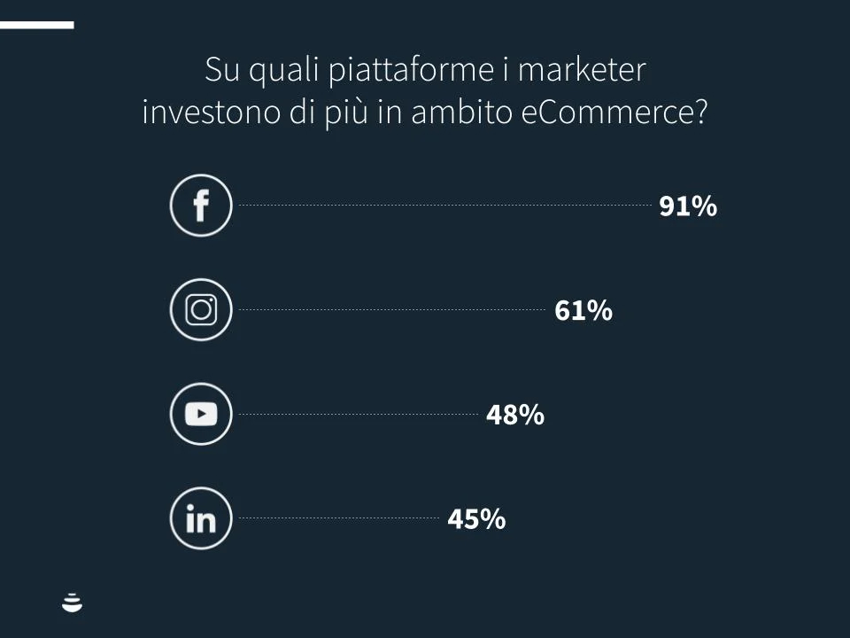 - Gli investimenti in ricerca a pagamento, pubblicità display, pubblicità sui social media, pubblicità video online ed email marketing rappresenteranno il 46% dell’intera attività di marketing entro il 2021