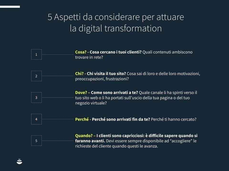 Sono cinque i fattori da considerare quando usi un approccio che dia importanza alla digital transformation: