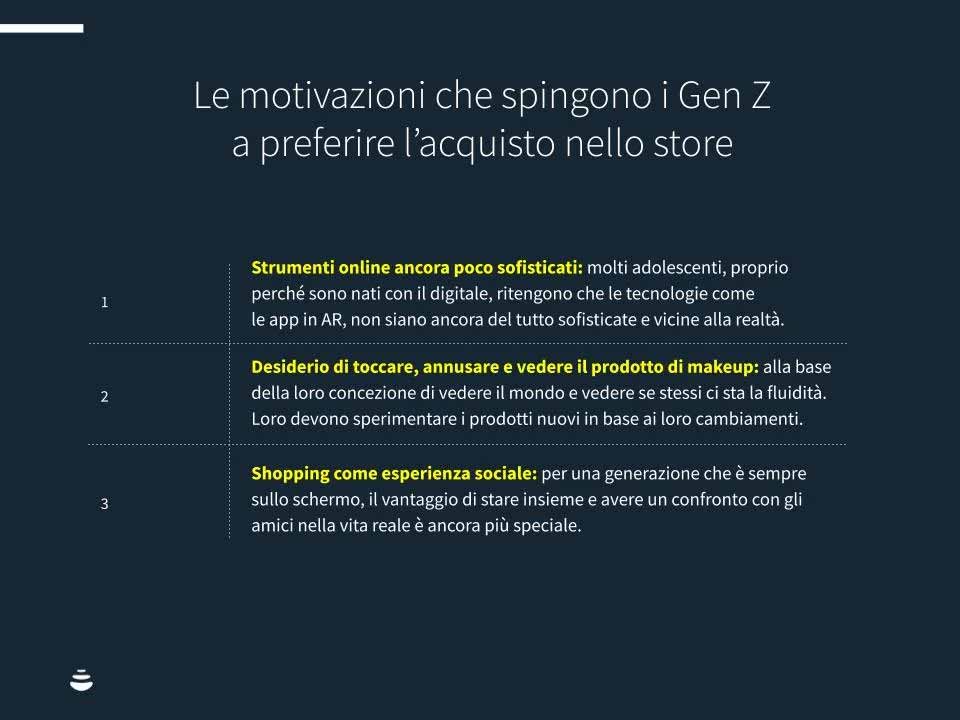 La stragrande maggioranza di acquirenti della Gen Z affermano di preferire l’acquisto di prodotti di cosmesi e makeup in punti vendita fisici perché non si sentono del tutto soddisfatti della tecnologia che c’è attualmente .