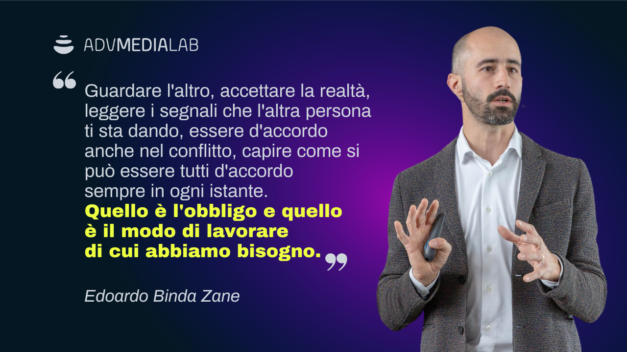 Edoardo Binda Zane: Ma secondo me c’è un bisogno mostruoso di un lavoro di questo tipo, non soltanto del risultato creatività, ma anche di tutto quello che comporta. Cioè, ripartendo dalla definizione di Cleese, che non è un talento ma è una modalità operativa, le dinamiche operative di gruppo, lavorative che devono essere messe in piedi per poi generare le condizioni entro cui si possa essere creativi, sono condizioni di cui c’è un bisogno estremo, per cui confidenza l’uno con l’altro, rispetto, sicurezza psicologica, capacità di ridere insieme in modo sano, perché non tutto lo humor è sano, il sarcasmo va evitato, per esempio. Per cui sì, c’è un bisogno mostruoso di creatività, della capacità di generare idee a comando. Ma non è che facciamo un workshop e improvvisamente ci arriviamo, no.