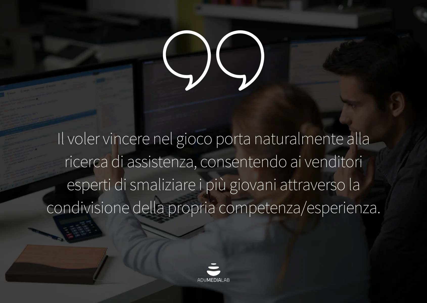 Il voler vincere nel gioco porta naturalmente alla ricerca di assistenza , consentendo ai venditori esperti di smaliziare i più giovani attraverso la condivisione della propria competenza/esperienza.