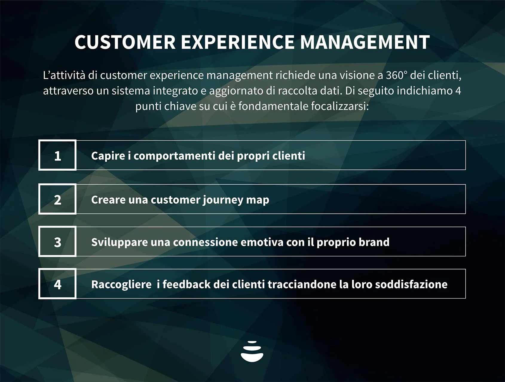 Il termine customer experience management indica la capacità di raggiungere, coinvolgere e ascoltare i clienti in modo trasparente attraverso i diversi canali, unità di business, mercati e tutti i team che si rivolgono al cliente.