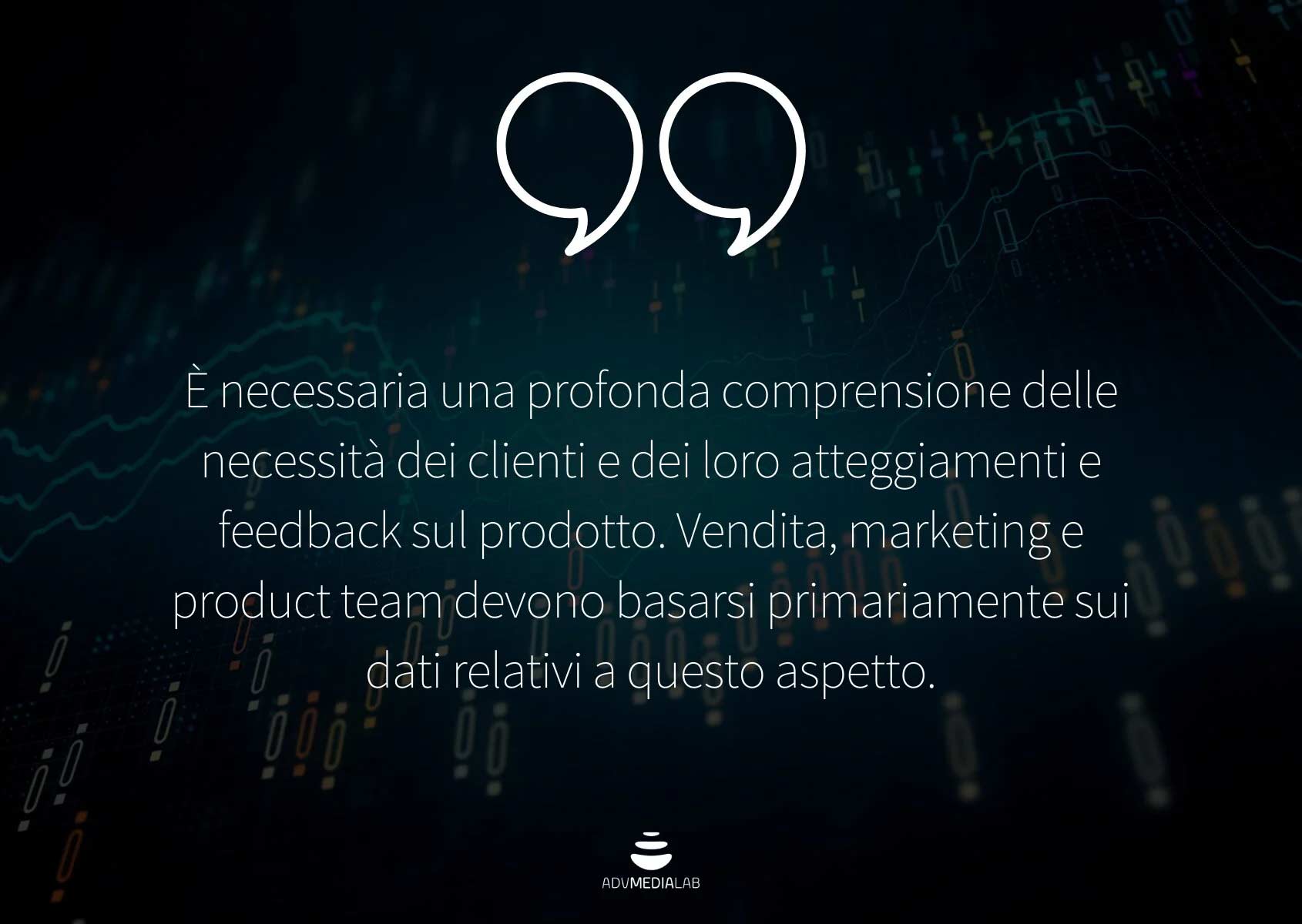 E’ necessaria una profonda comprensione delle necessità dei clienti e dei loro atteggiamenti e feedback sul prodotto. Vendita, marketing e product team devono basarsi primariamente sui dati relativi a questo aspetto.