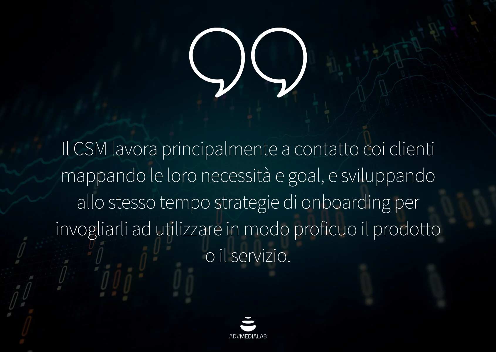 Il CSM lavora principalmente a contatto coi clienti mappando le loro necessità e goal , e sviluppando allo stesso tempo strategie di onboarding per invogliarli ad utilizzare in modo proficuo il prodotto o il servizio.