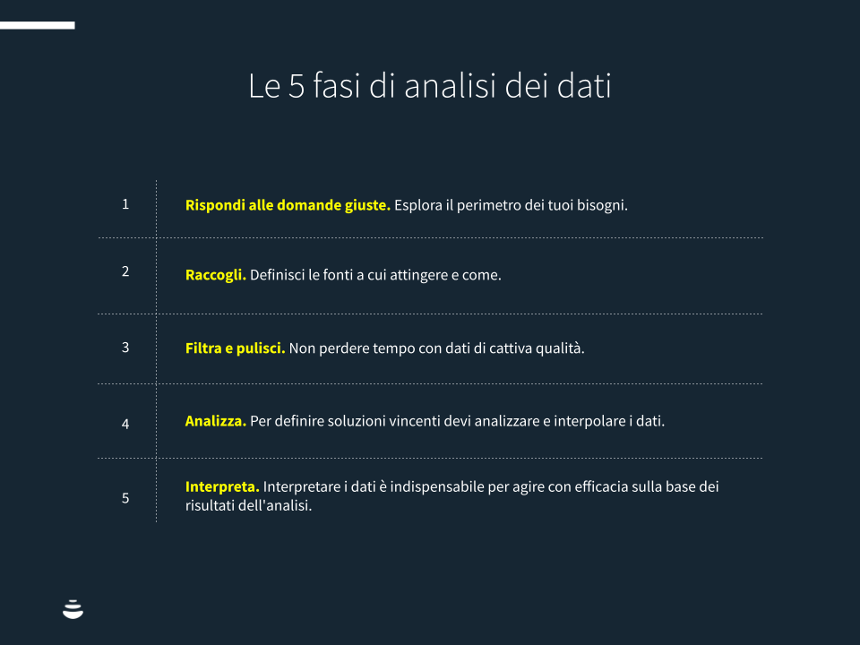 Interpreta . Ultima fase per ordine ma non per importanza, interpretare i dati è indispensabile per agire con efficacia sulla base dei risultati dell’analisi