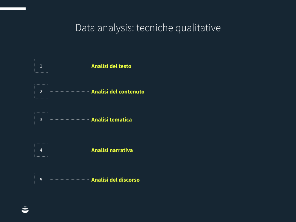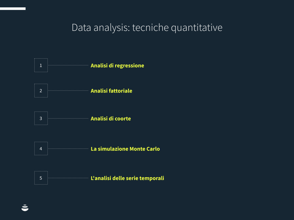 Quelle appena viste sono le principali tecniche quantitative di data analysis. Esistono altre tecniche dette qualitative.