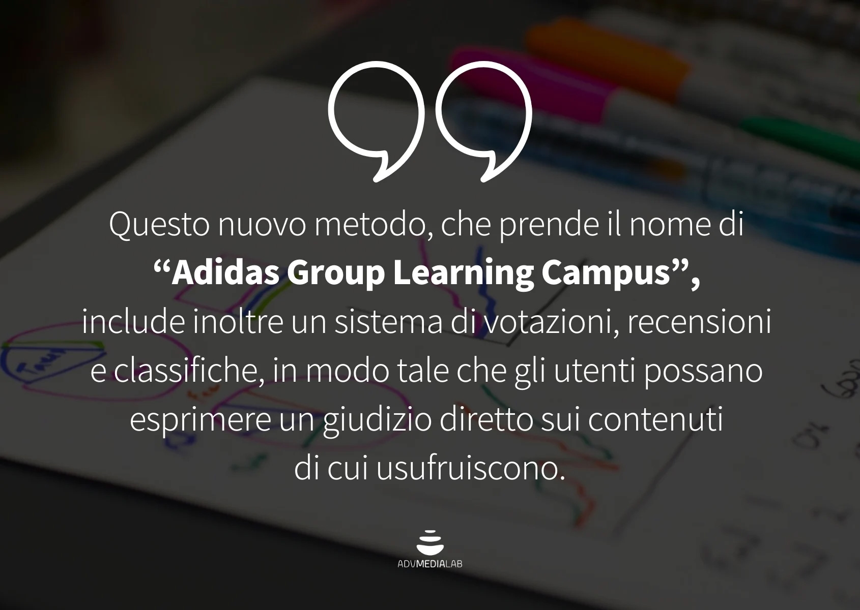 Questo nuovo metodo, che prende il nome di “Adidas Group Learning Campus”, include inoltre un sistema di votazioni, recensioni e classifiche, in modo tale che gli utenti (ossia, i dipendenti) possano esprimere un giudizio diretto sui contenuti di cui usufruiscono.
