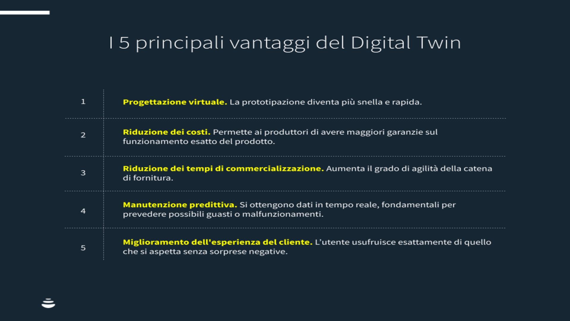 La tecnologia Digital Twin riduce il numero delle lunghe iterazioni che nel mondo reale sono necessarie a ottenere un prodotto considerato a “regola d’arte” e pronto per essere commercializzato. Diminuisce il time-to-market ovvero il tempo di commercializzazione .
