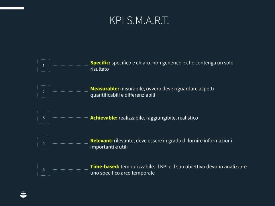 - Benchmark: i KPI hanno senso solo se rapportati ad una baseline che vuoi tenere sotto controllo e più sono specifici e misurabili più potrai monitorarli ed ottenere informazioni utili