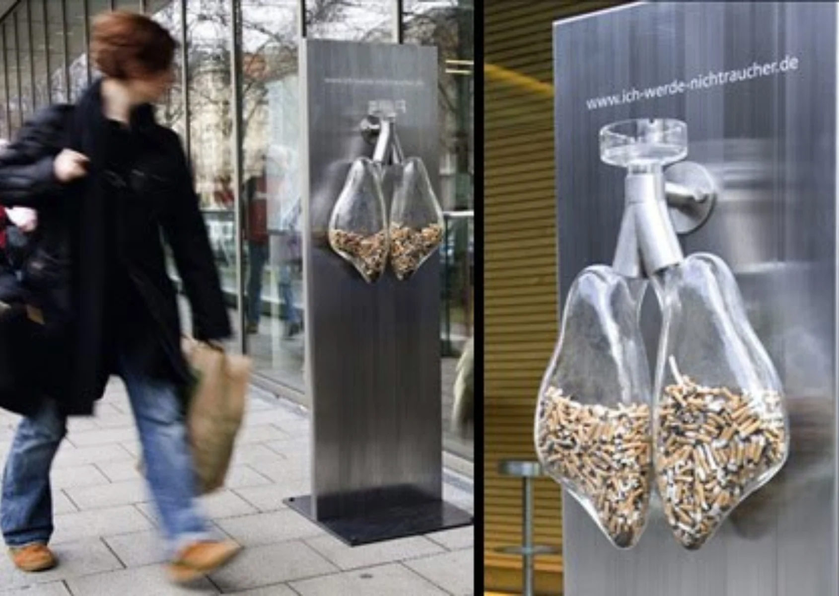 Una buona campagna sul tabagismo è quella ideata da una compagnia di assicurazione sanitaria tedesca. Tale campagna sfrutta la curiosità stimolata dalla particolarità del posacenere a forma di polmoni (che si presume debba essere usato dai fumatori che passeranno davanti ad esso) per dare una comunicazione immediata, senza parole.