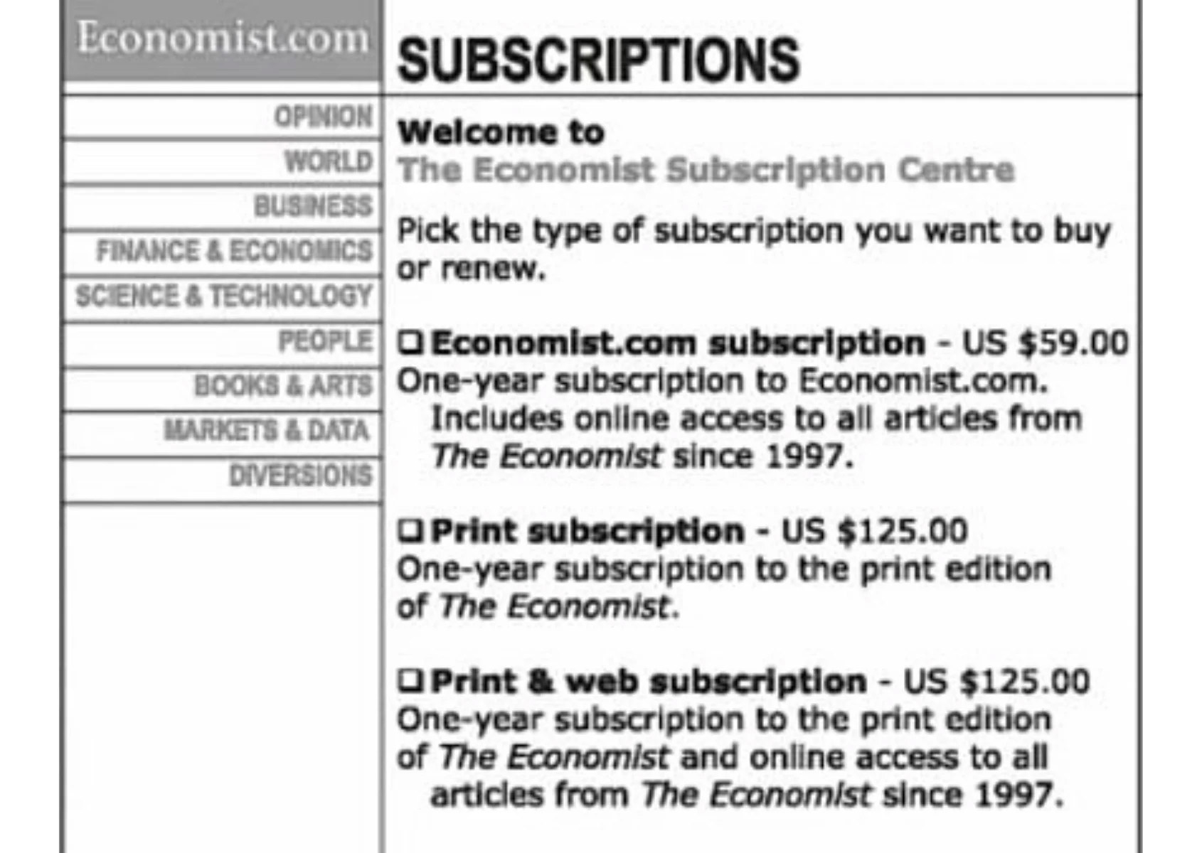 Dan Ariely, un brillante professore americano di economia comportamentale, fa l’esempio di un’offerta di qualche tempo fa per abbonarsi alla rivista The Economist. L’offerta prevedeva le seguenti opzioni: