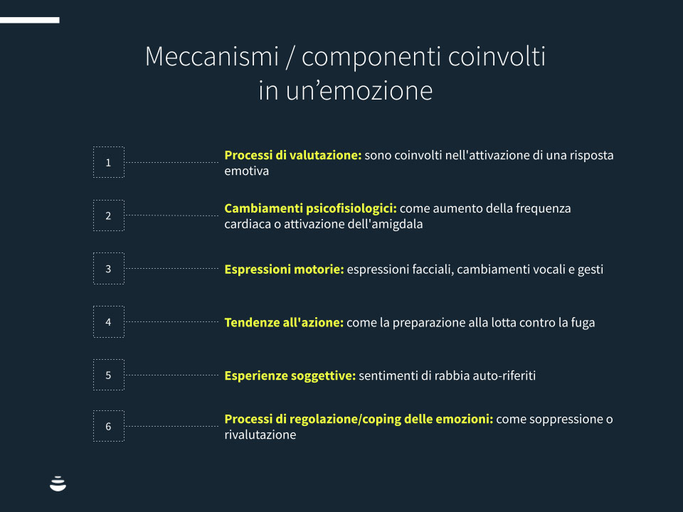 Pertanto, si ritiene che l’emozione coinvolga diversi meccanismi / componenti che includono:
