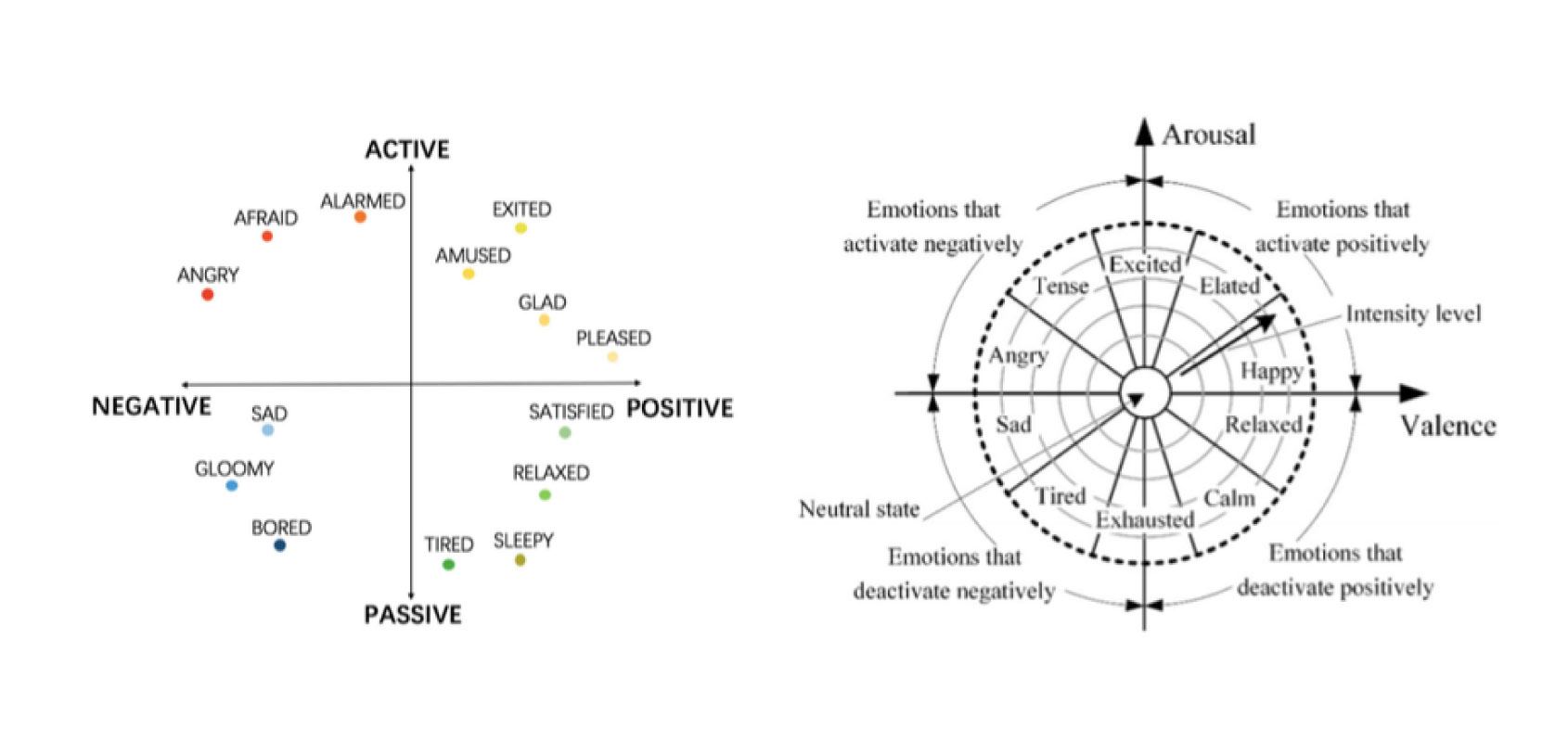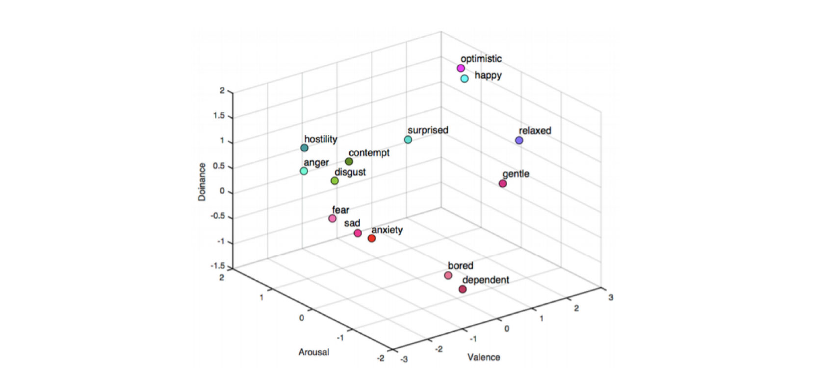 D’altra parte, le emozioni con le stesse descrizioni possono avere intensità diverse. Ad esempio “felice” potrebbe essere descritto come “un po’ felice” o “molto felice”. Pertanto, gli psicologi hanno cercato di costruire modelli spaziali emozionali multidimensionali.