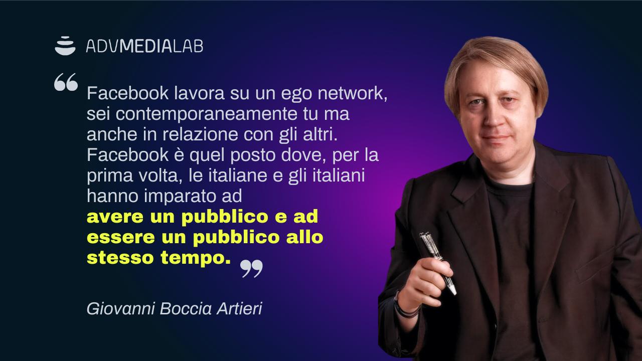 Detto questo, ovviamente, parliamo di ambienti sociali connessi, cioè dove queste componenti si legano agli altri. Allora, prendiamo Facebook. Come è fatto Facebook? Facebook lavora su un ego network. Cioè, ci sei tu al centro, comincia a seguire delle persone, delle persone ti seguono. Però fondamentalmente sei tu posto al centro di una rete. Sei tu che posti, sei tu che commenti. Quindi, come dire, sei contemporaneamente tu ma anche in relazione con gli altri. Io questa cosa cerco di spiegarla così: Facebook è quel posto dove, per la prima volta, le italiane e gli italiani hanno imparato ad avere un pubblico e ad essere un pubblico allo stesso tempo. Tu quando posti qualcosa hai un pubblico, ma allo stesso tempo non puoi essere pubblico del tuo pubblico perché leggi le loro cose.