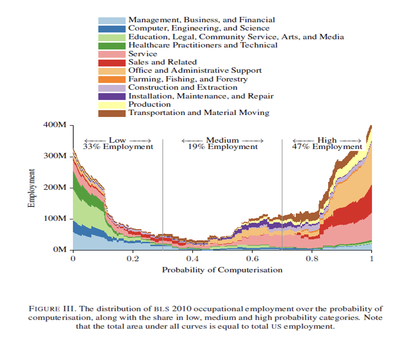 L’impatto occupazionale previsto è riportato nella Figura III (dello studio), e distingue tra occupazioni ad alto, medio e basso rischio, a seconda della loro probabilità di computerizzazione.