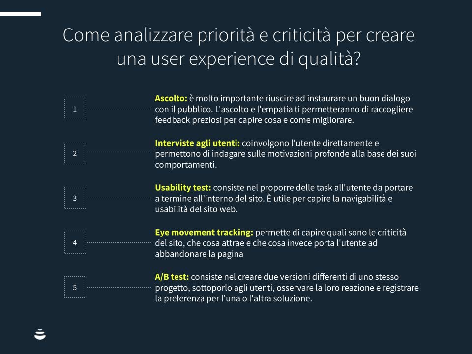 Ascolto . Come vedremo anche in seguito, è molto importante riuscire ad instaurare un buon dialogo con il pubblico . Utilizza i social media e i sondaggi per capire le aspettative e le criticità dell’utente. L’ascolto e l’empatia ti permetteranno di raccogliere feedback preziosi per capire cosa e come migliorare