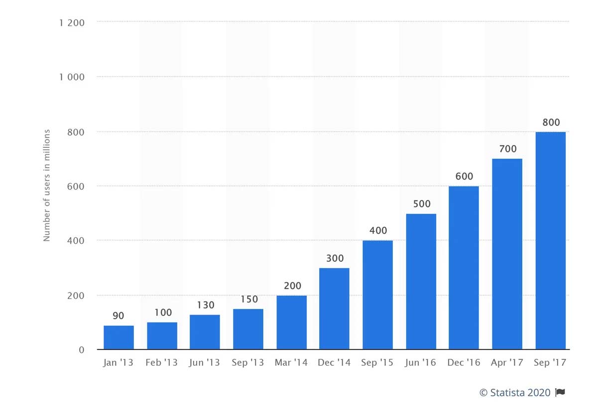 Number of monthly active Instagram users from January 2013 to June 2018 (in millions).