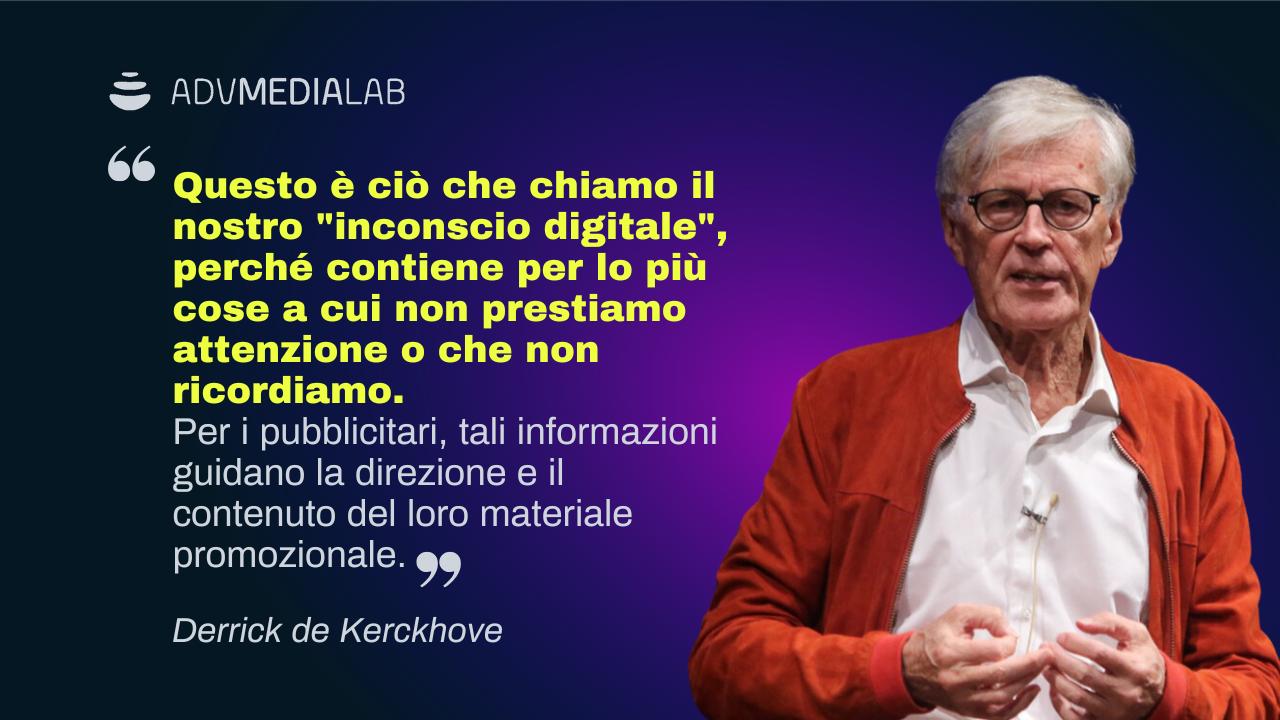 Derrick de Kerckhove: La definizione che ho dato all’inconscio digitale è “Tutto che si sa su di te che tu non sai”. Tutto ciò che facciamo viene pubblicato automaticamente in tracce di dati che vengono correlate tra più banche dati in diversi flussi di interesse per diventare utilizzabili a favore o contro di noi a seconda delle circostanze. Questo è ciò che chiamo il nostro “inconscio digitale”, cioè non ne siamo consapevoli, perché contiene per lo più cose a cui non prestiamo attenzione o che non ricordiamo. Eppure, ad esempio, il monitoraggio legittimo delle nostre spese in un determinato periodo fornisce alla banca un numero sufficiente di dati che, una volta incrociati ed esaminati, forniscono più informazioni utili su di noi di quante ne potremmo ricordare o correlare.