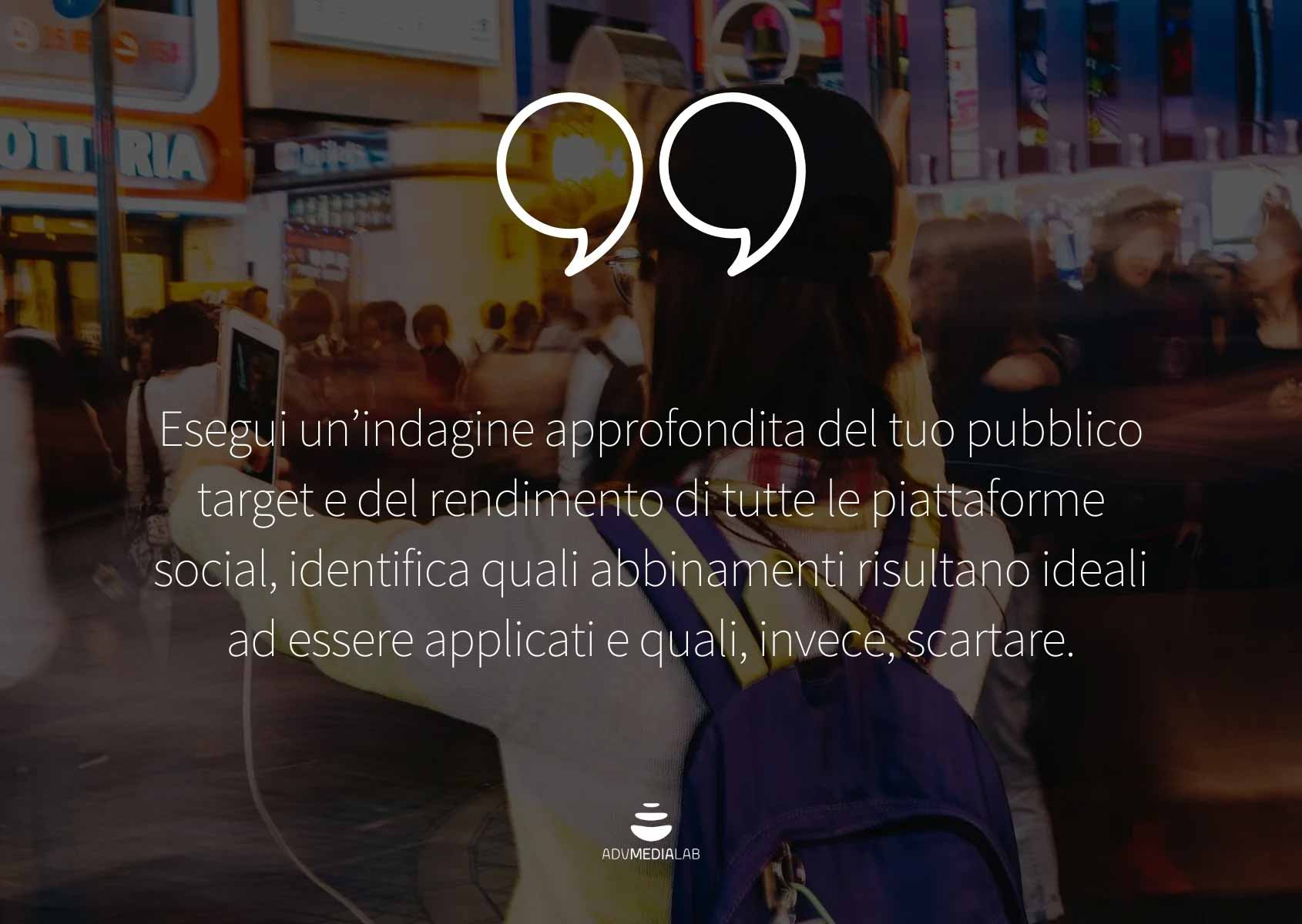 Esegui un’indagine approfondita del tuo pubblico target e del rendimento di tutte le piattaforme social , così da riscontrare visivamente quali abbinamenti risultano ideali ad essere applicati e quali, invece, scartare.