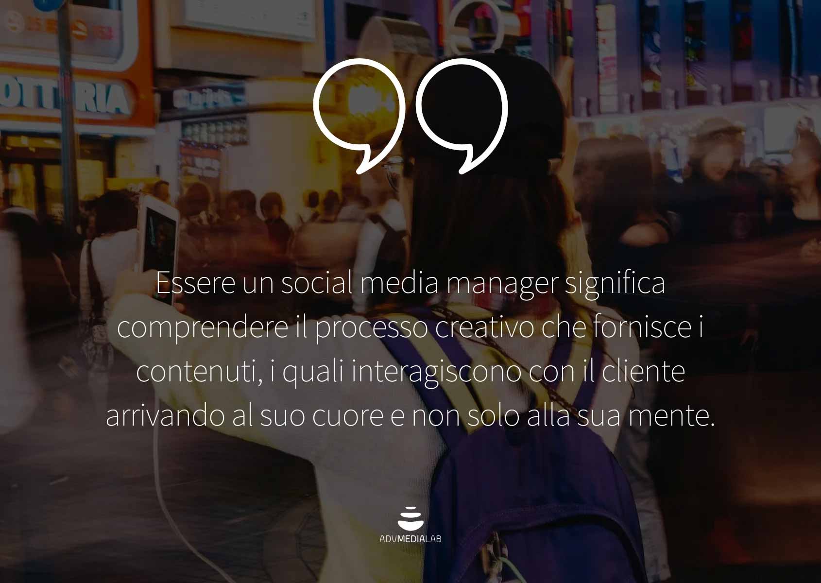 Il social media marketing non è solo tattiche e schemi da seguire: essere un social media manager significa anche comprendere il processo creativo che fornisce i contenuti , i quali interagiscono con il cliente toccandolo nel profondo, arrivando al suo cuore e non solo alla sua mente .