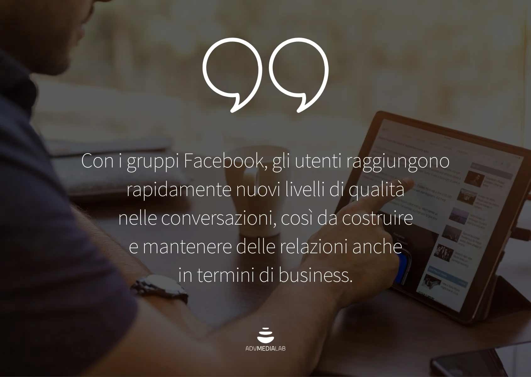 Il discorso cambia quando si parla dei gruppi di Facebook: gli utenti raggiungono rapidamente nuovi livelli di qualità nelle conversazioni , è in questo modo che si costruiscono e mantengono delle relazioni anche in termini aziendali.