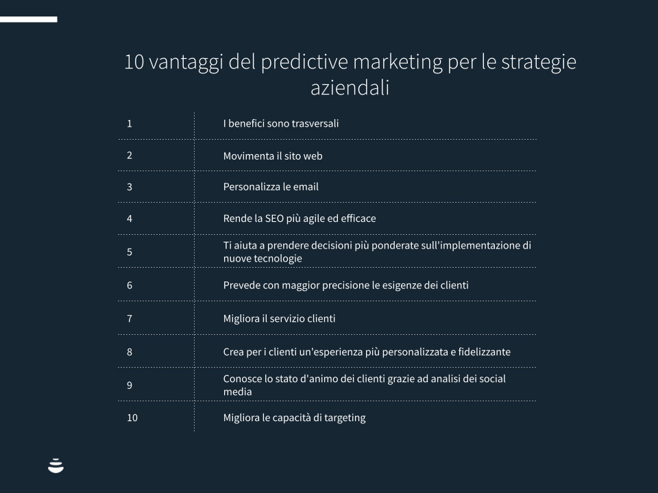 Implementare strategie d’analisi predittiva: funzionamento e caratteristiche . Integrare il marketing predittivo nella tua strategia aziendale può rivelarsi un procedimento complesso. Ti forniremo linee guida strategiche e suggerimenti per semplificarti il compito