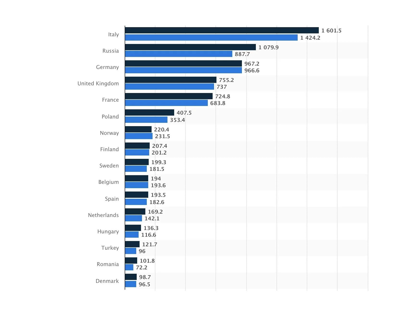Valore del mercato degli integratori alimentari nell’area euroasiatica dal 2015 al 2020 suddiviso per Paese in milioni di euro. Fonte Statista.