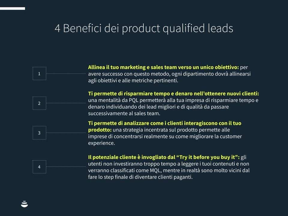 La strategia basata sul product qualified lead è consigliabile anche alle startup , poiché allinea gli obiettivi del prodotto e il team di progettazione con il resto dell’azienda.