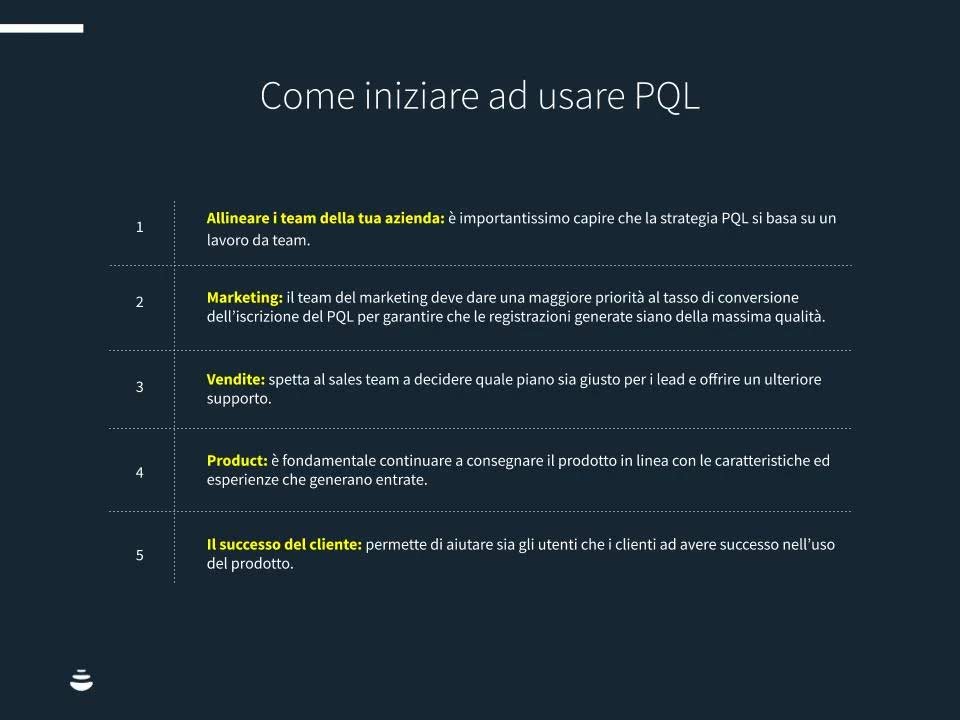 Questo è dovuto al fatto che nel MQL l’allineamento viene fatto solamente tra i team del marketing e delle vendite, mentre nel PQL è necessario che tutti i team lavorino insieme .