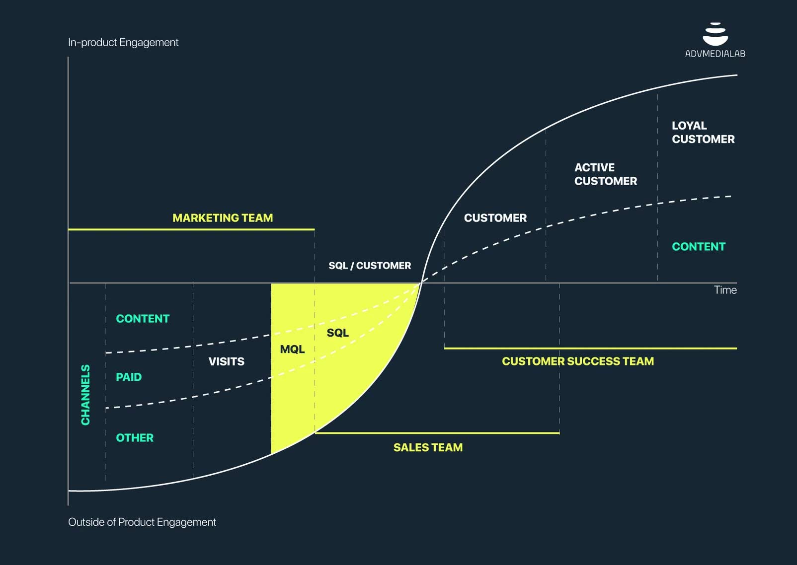 Come appena mostrato dal grafico, in una strategia di MQL una buona parte del processo di acquisizione del cliente avviene al di fuori del prodotto .