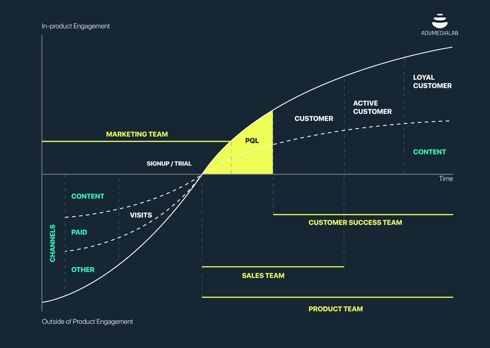 Come si può constatare, in una strategia di PQL il customer lifecycle tende a spostarsi di più nell’area sopra l’asse orizzontale , dove il product behavior diventa essenziale per guidare gli utenti e i clienti attraverso il lifecycle.