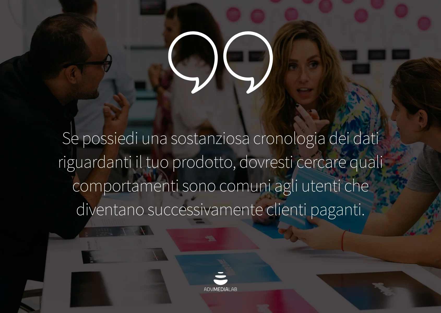 Se possiedi una sostanziosa cronologia dei dati riguardanti il tuo prodotto , dovresti cercare di individuare quali comportamenti sono comuni agli utenti che diventano successivamente clienti paganti .