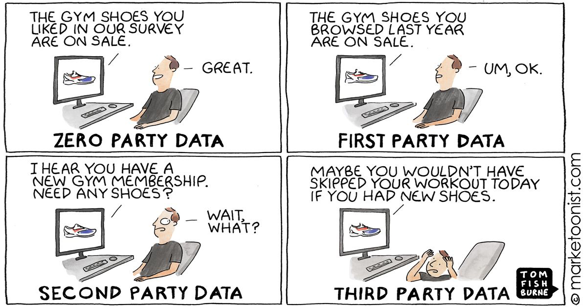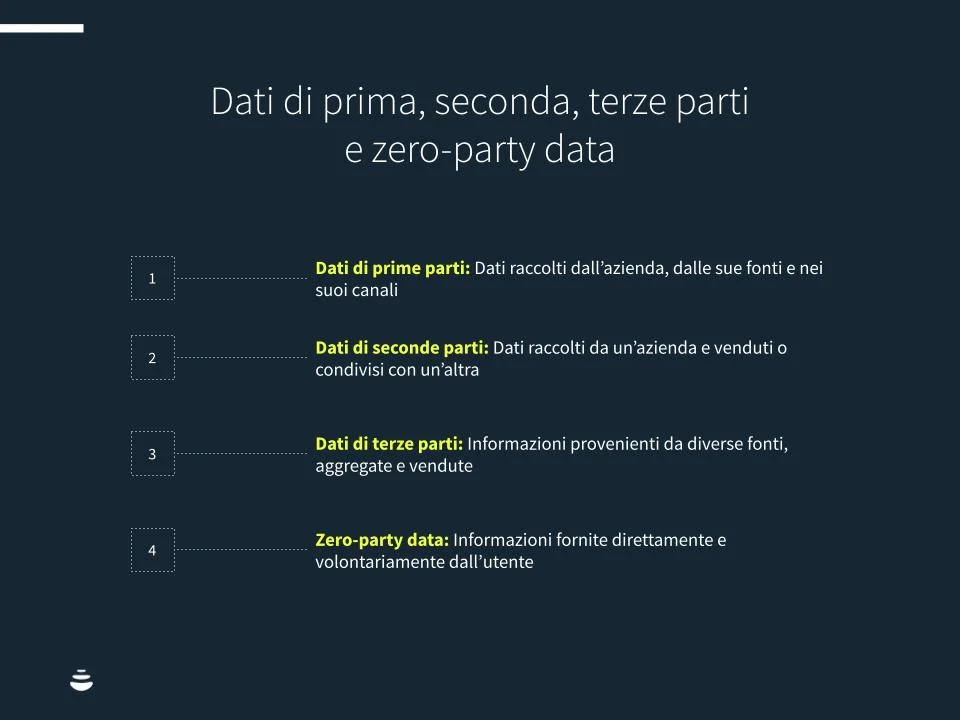 - Con i dati zero-party, l’azienda ottiene le informazioni direttamente dal cliente. Si risponde alle domande per ottenere un’esperienza personalizzata nella navigazione sul sito, nell’advertising o nel percorso d’acquisto. Una soluzione che guarda al futuro con nuova trasparenza ed allineamento nel rapporto tra il cliente e l’azienda.