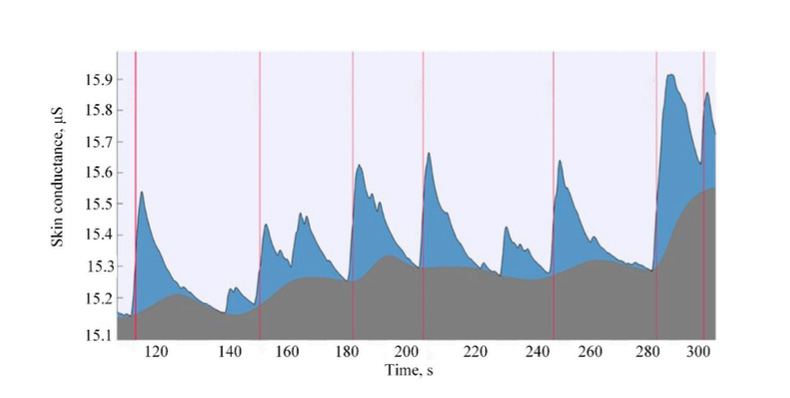 Nella seguente figura è fornito un esempio di rilevazione del segnale elettrico relativo alla risposta galvanica della pelle durante la somministrazione di trigger introdotti dallo sperimentatore : come è possibile notare, i picchi di conduttanza coincidono con la somministrazione del trigger.