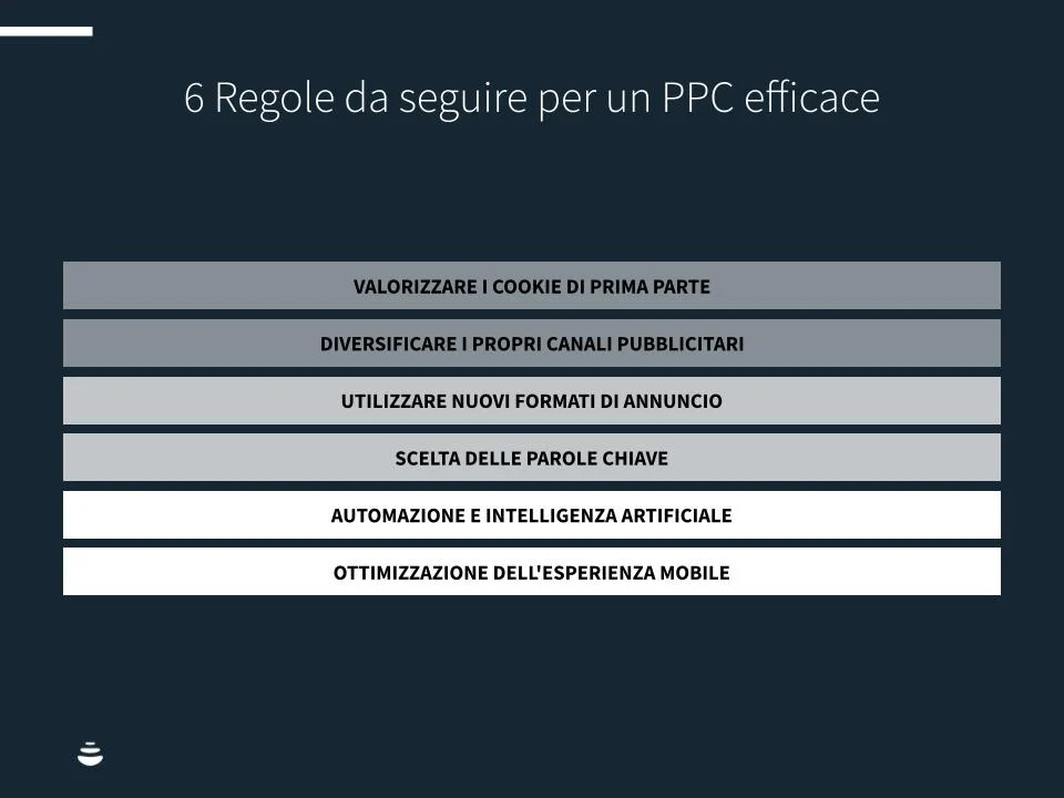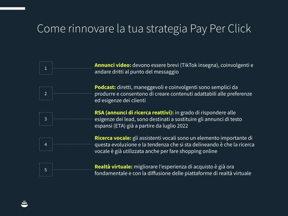 Le strategie da seguire sul PPC nel 2022 . L’area marketing deve interrogarsi sui possibili scenari per capire come massimizzare il ROI (Return On Investment). Ecco 6 consigli per cavalcare il cambiamento