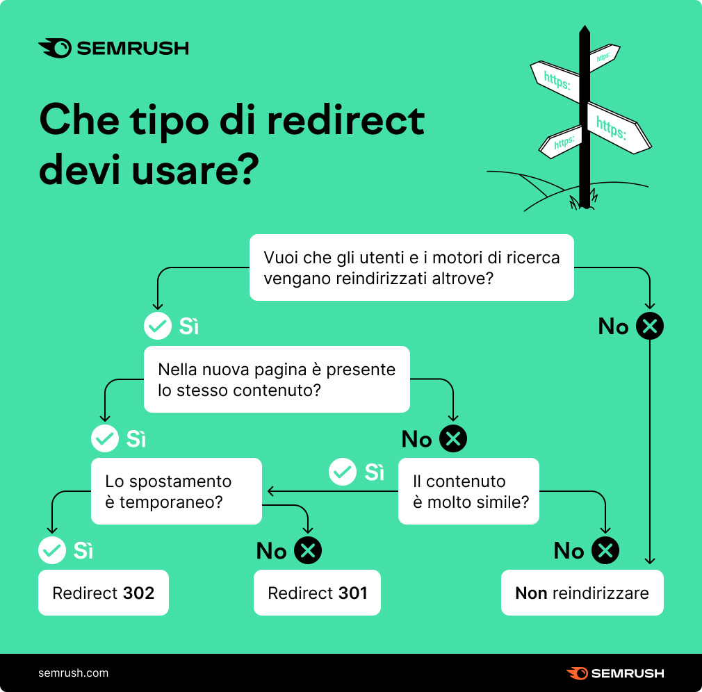 Molte volte basta semplicemente reindirizzare un singolo URL, altre volte devi reindirizzare un intero dominio. La cosa più importante è capire che esistono diversi tipi di redirect da usare e che ognuno deve essere valutato in base alla situazione e all’obiettivo.