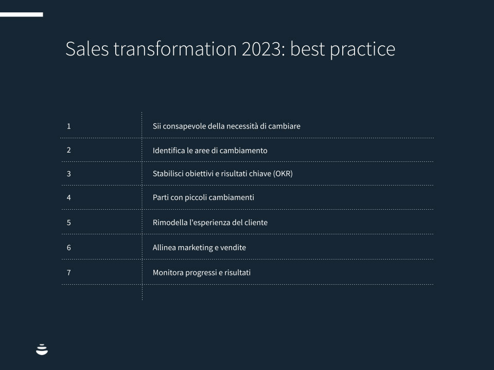 Quali sono le migliori strategie e best practice per guidare la sales transformation aziendale? Abbiamo raccolto le principali tendenze di sales transformation 2023 , per una trasformazione digitale a prova di concorrenza.