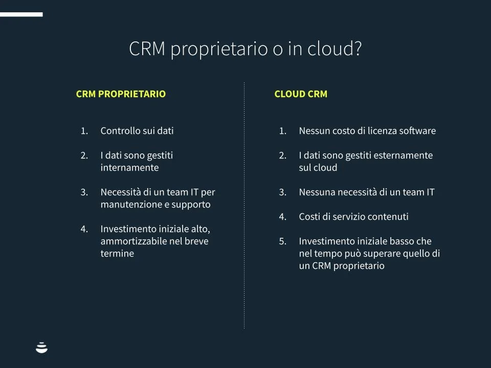 La prima questione riguarda la scelte di un CRM proprietario o una soluzione in cloud. Nel primo caso, si acquista un software che lavorerà all’interno dell’azienda, la cui gestione e manutenzione rimane aziendale.