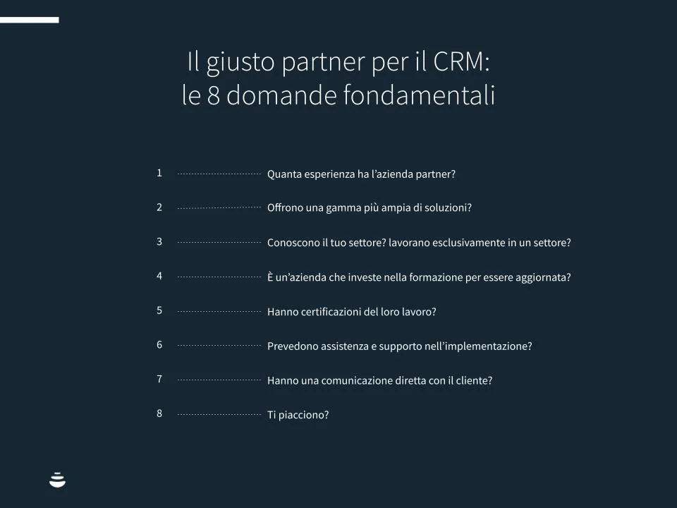- Per scegliere il partner migliore, oltre alle caratteristiche tecniche, è necessario porsi delle domande per comprendere meglio la relazione da costruire. Implementare il CRM significa iniziare un processo di trasformazione che riguarda l’intera azienda e avere i giusti alleati esterni può diventare fondamentale.