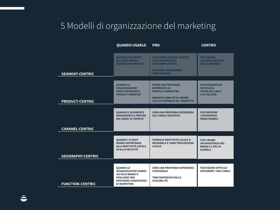 Per esempio, un’azienda con l’obiettivo di creare e sostenere un’organizzazione orientata al cliente potrebbe scegliere il modello segment-centric per la sua organizzazione di marketing.